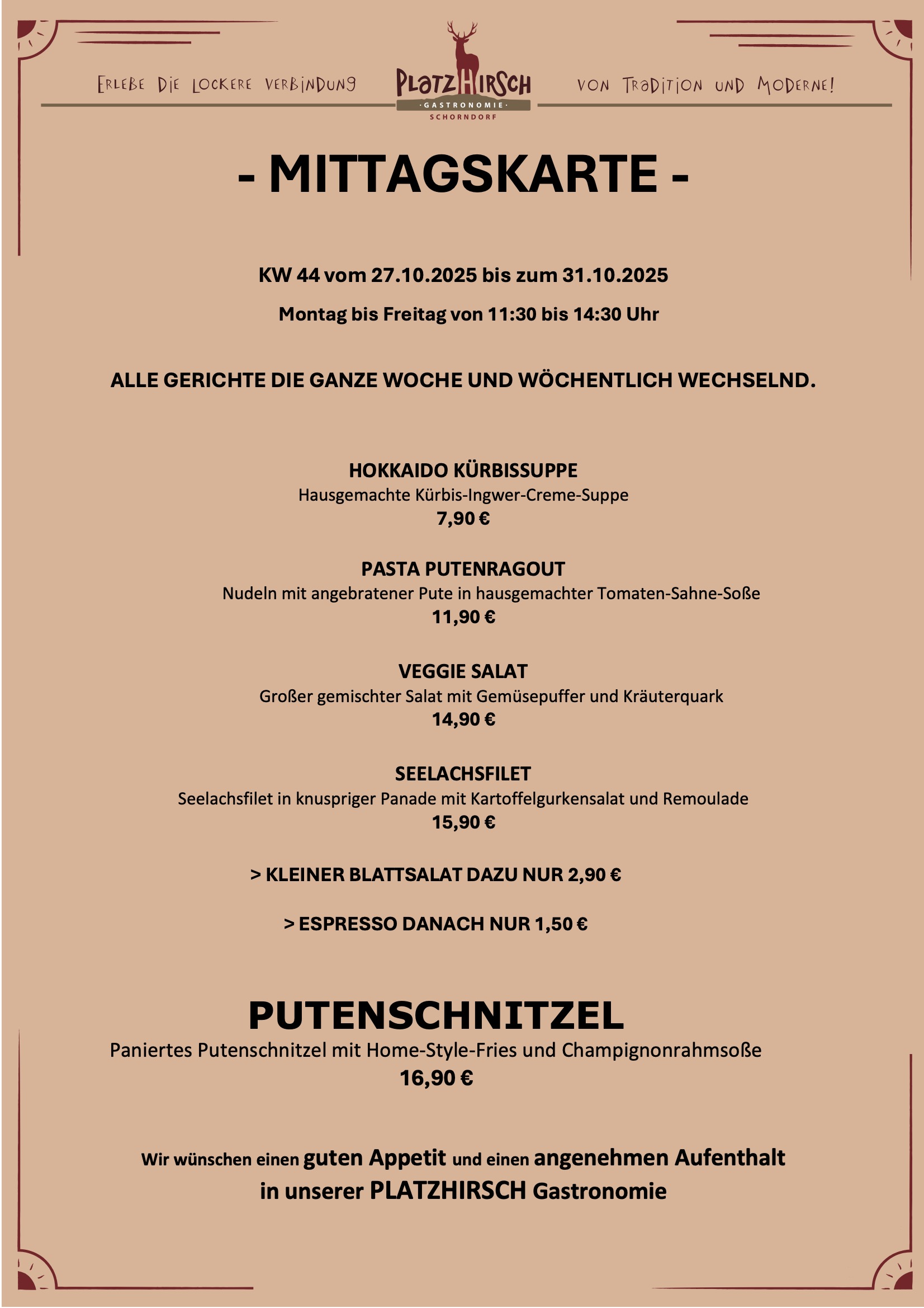 Die Platzhirsch Gastronomie, lädt zu deutschen Gaumenfreuden und internationalen Speisen ein.